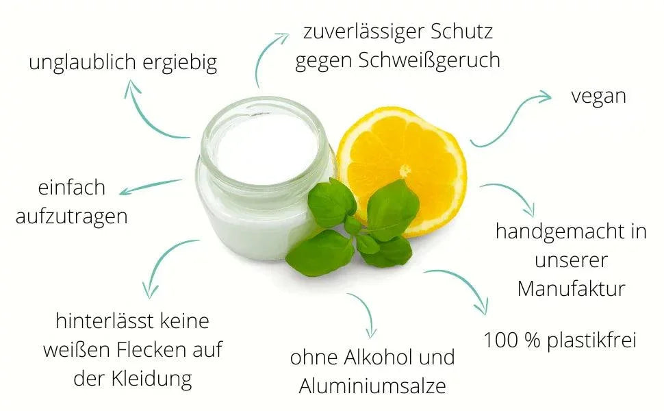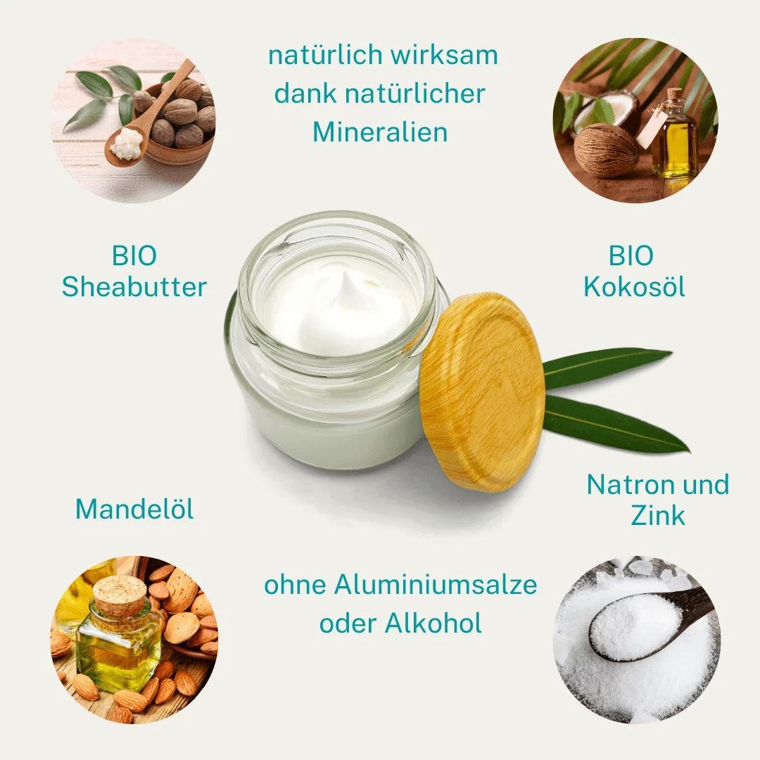 Das Besondere an unserem Deo ist seine natürliche Zusammensetzung ohne Alkohol, Aluminiumsalze, Mineralöle oder Konservierungsstoffe. Stattdessen pflegen BIO Sheabutter, BIO Kokosöl und Mandelöl die empfindliche Achselregion sanft und sorgen für ein geschmeidiges Hautgefühl. Das enthaltene Natron wirkt geruchsneutralisierend, während Zink für eine dezente Schutzwirkung sorgt.
