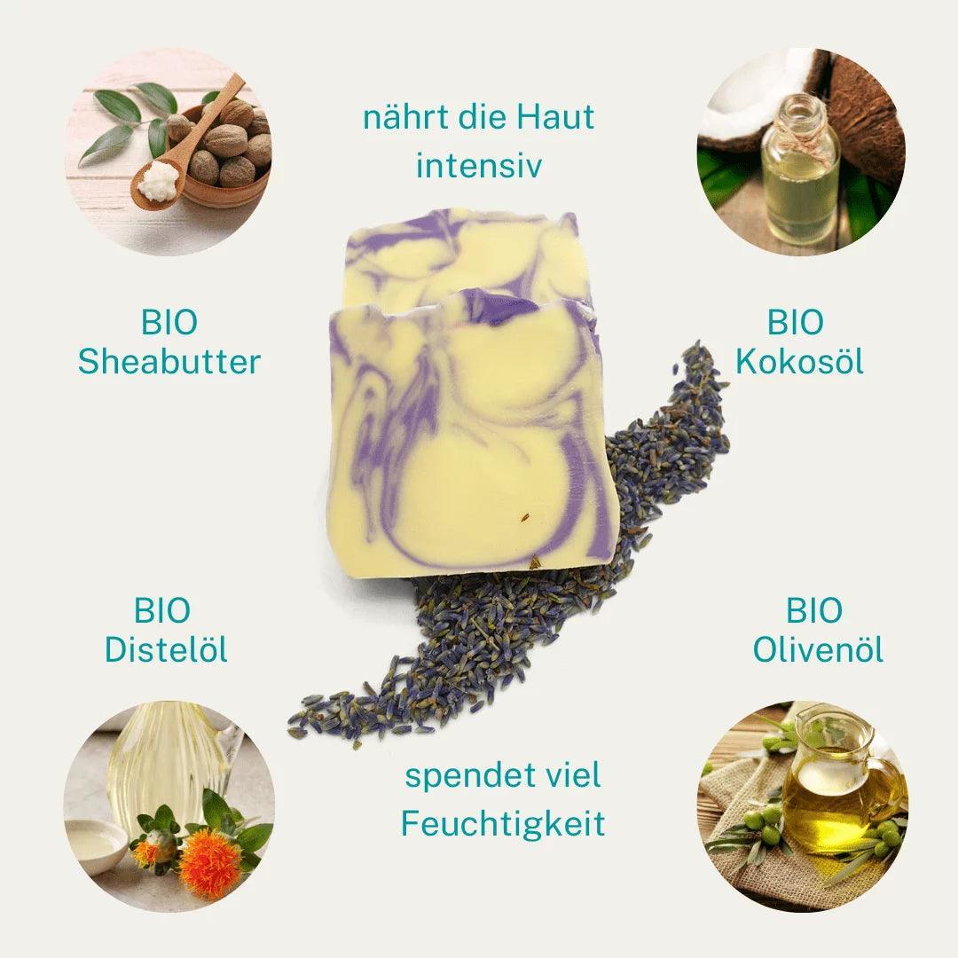 Wasser, BIO Olivenöl, BIO Kokosöl, BIO Distelöl, BIO Sheabutter,  Natriumhydroxid, Meersalz, BIO Rizinusöl, ätherisches Lavendelöl,  Kosmetikpigmente