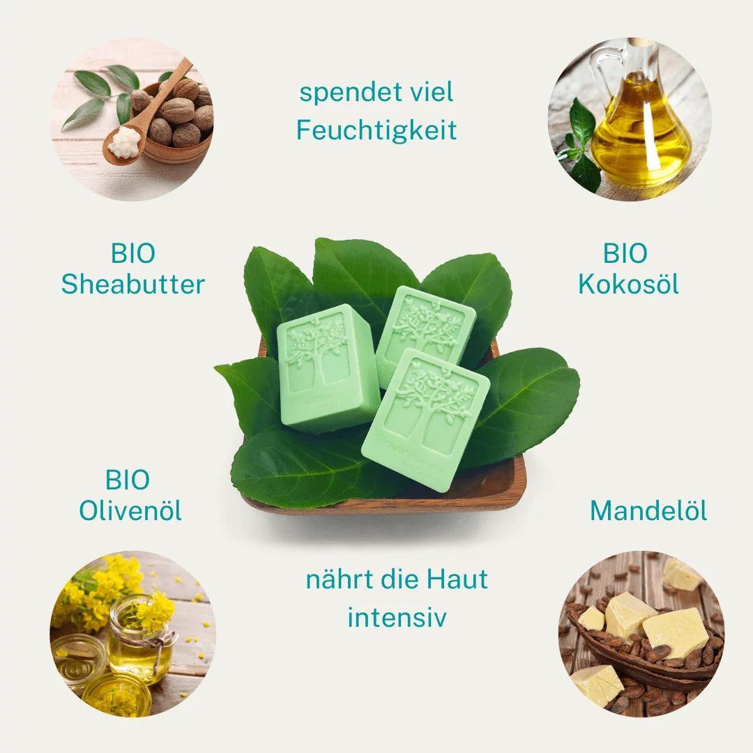 Wasser, BIO Olivenöl, BIO Kokosöl, BIO Kakaobutter, BIO Rapsöl, NaOH, Mandelöl, Duftöl