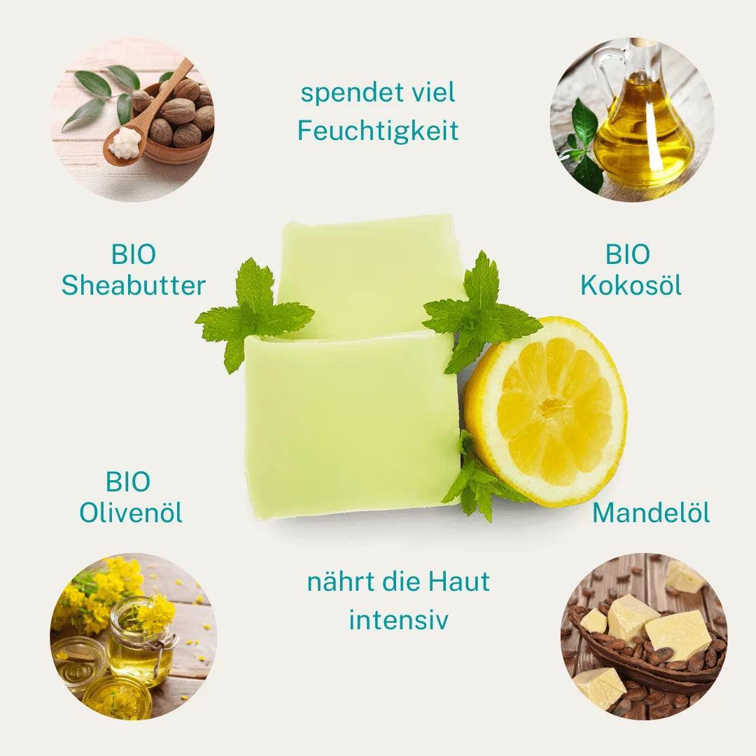 Unsere Seife Minze Zitrone steht für Qualität und Transparenz. Wir verwenden ausschliesslich natürliche Inhaltsstoffe in bester BIO Qualität, damit du genau weisst, was auf deine Haut kommt. Unsere Produkte sind frei von künstlichen Zusätzen, sodass du mit gutem Gewissen geniessen kannst. Die Herkunft unserer Zutaten ist uns wichtig, denn wir glauben an die Kraft der Natur.