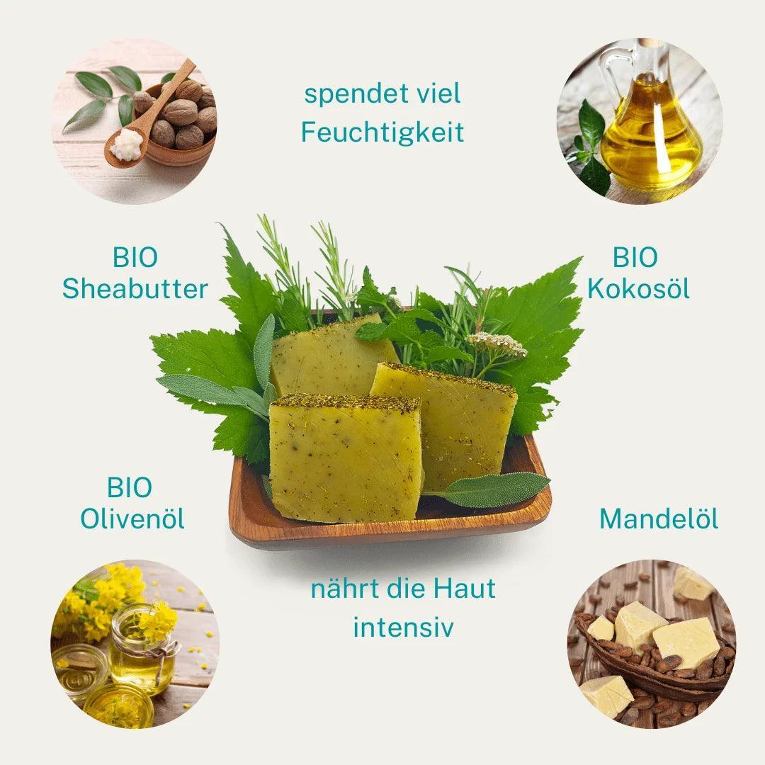 Unsere Peelingseife ist ein echtes Original: Die intensive grüne Farbe stammt ausschliesslich von sorgfältig ausgewählten Wildkräutern und dem kaltgepressten BIO Avocadoöl – ganz ohne künstliche Farbstoffe. Mit 15 Prozent Überfettung pflegt sie deine Haut besonders sanft, während Kakaobutter, Olivenöl, Rapsöl und Kokosöl in feinster BIO Qualität für eine natürliche Geschmeidigkeit sorgen. Der leichte Peelingeffekt durch die Wildkräuter regt die Durchblutung an und entfernt sanft abgestorbene Hautschüppchen.