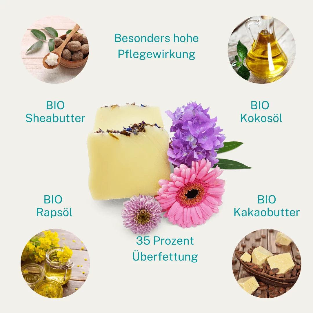 Die Duschbutter Blütenfrische ist mehr als nur ein Pflegeprodukt – sie ist eine Wohltat für deine Haut, besonders in den kalten Wintermonaten. Mit einem hohen Anteil an BIO Kakaobutter und BIO Sheabutter sowie einer beeindruckenden Überfettung von 35 Prozent, bietet sie der trockenen Haut die optimale Pflege, die sie verdient. Der tägliche Kampf gegen Trockenheit und Spannungsgefühle gehört der Vergangenheit an, denn mit dieser Duschbutter wird das Duschen zu einem entspannenden Ritual.