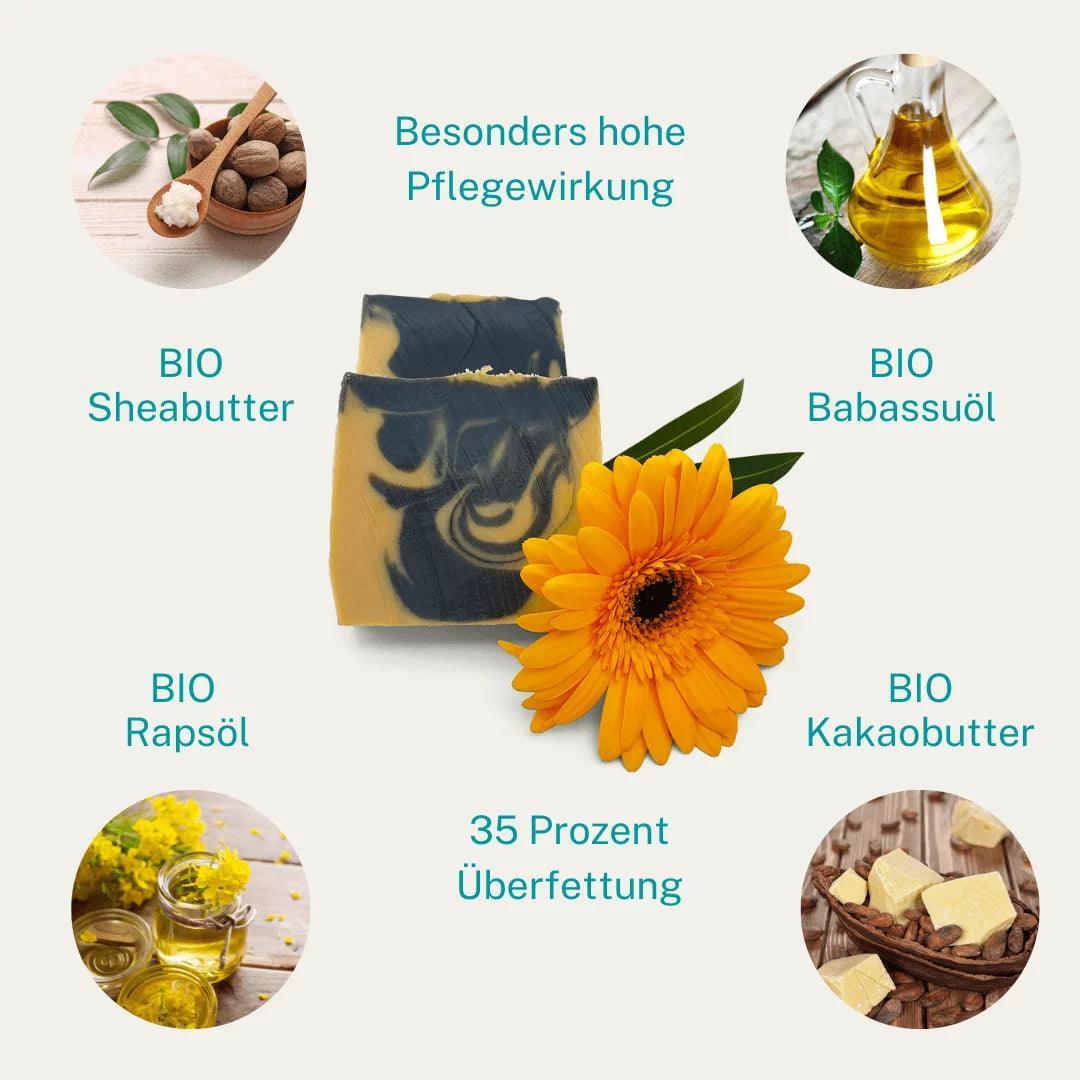 Wasser, BIO Sheabutter, BIO Babassuöl, BIO Rapsöl, BIO Kakaobutter, NaOH, Rizinusöl, Duftöl, Aktivkohle, Kosmetikpigmente