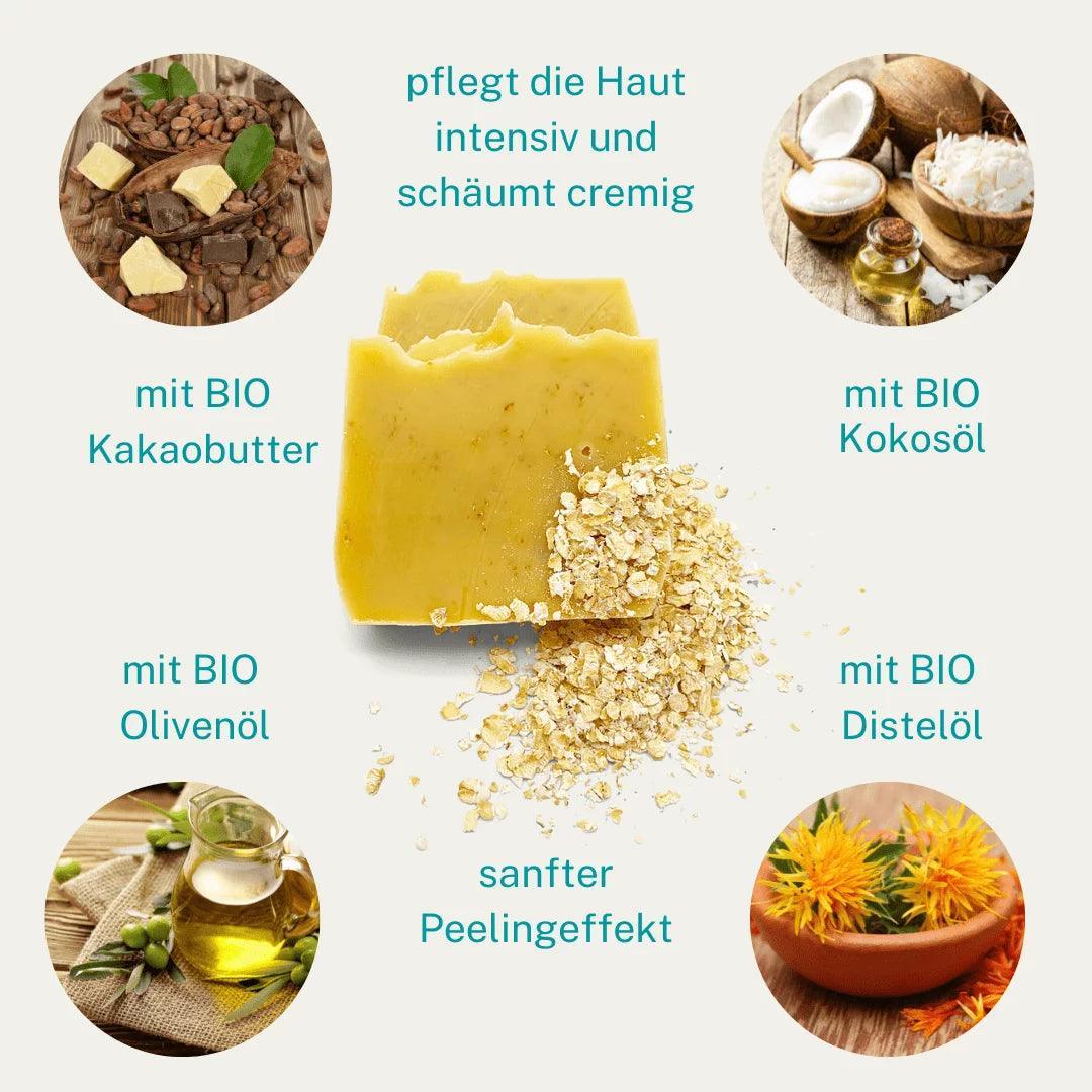 Hafermilch, Olivenöl, Distelöl, Kokosöl, Kakaobutter, Natriumhydroxid, Rizinusöl, Haferflocken, Duftöl