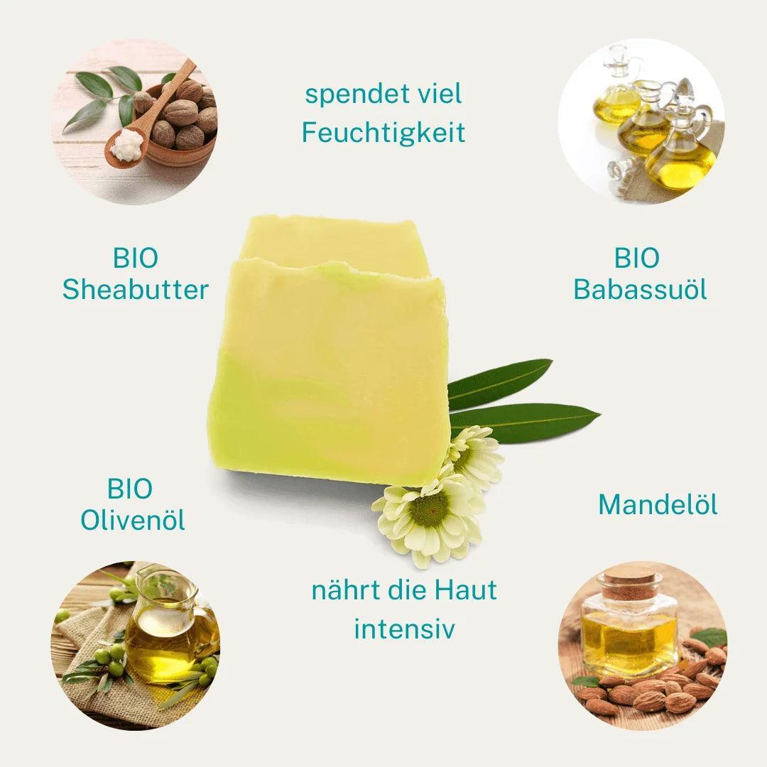 Was macht unsere Lindenblütenseife so besonders? Es sind die sorgfältig ausgewählten Inhaltsstoffe, die in feinster BIO-Qualität kommen. Sheabutter nährt die Haut intensiv, während Olivenöl für seine beruhigenden Eigenschaften bekannt ist. Das Kokosöl sorgt zudem für einen reichhaltigen Schaum, der das Duschen zu einem luxuriösen Erlebnis macht. Die Zugabe von Mandelöl rundet das Ganze ab und verleiht deiner Haut den letzten Schliff an Pflege.