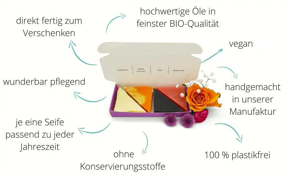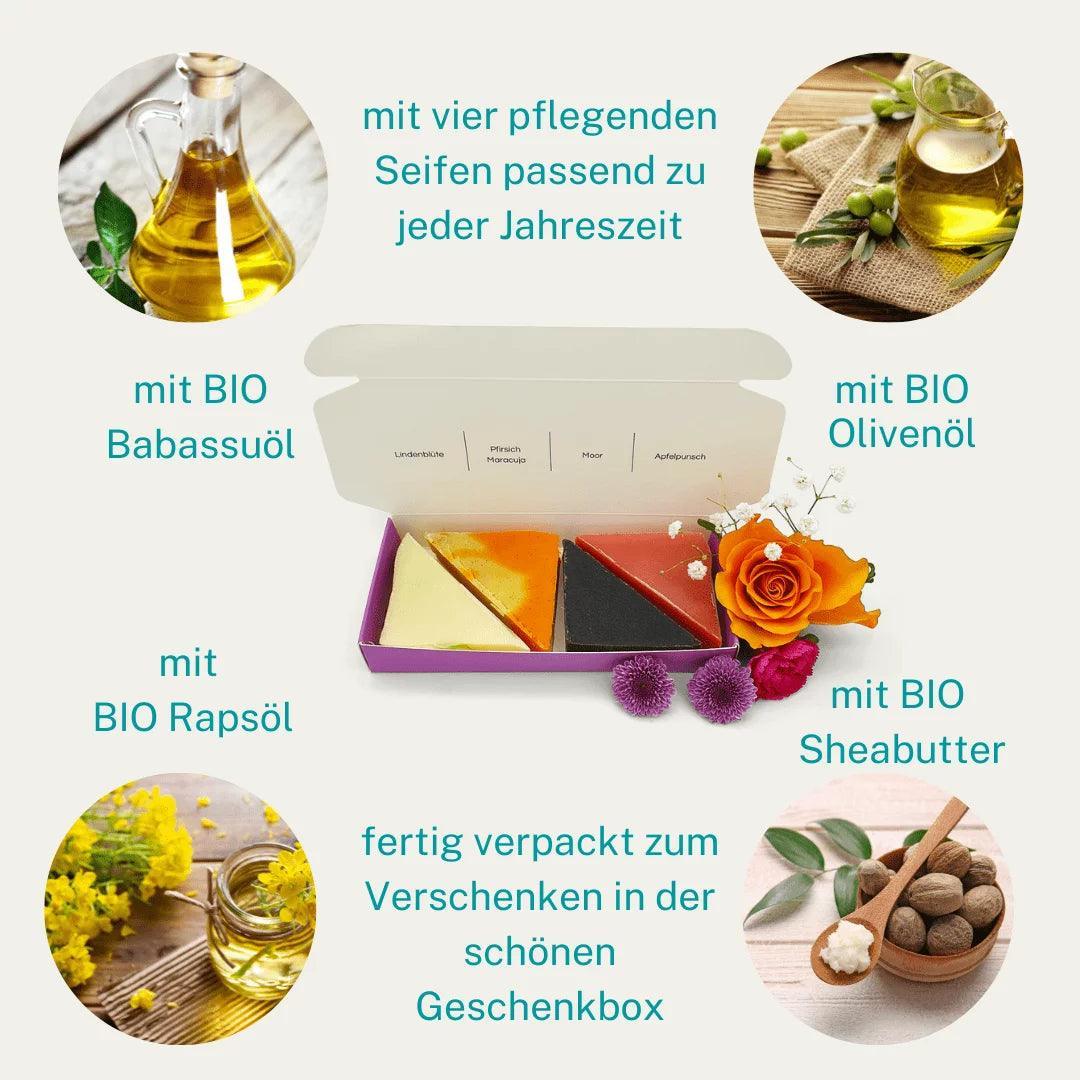 Eine kleine Reise durch die Jahreszeiten. Enthalten sind vier  duftende Naturseifen – passend zu jeder Jahreszeit von frühlingsfrisch  bis würzig-winterlich.