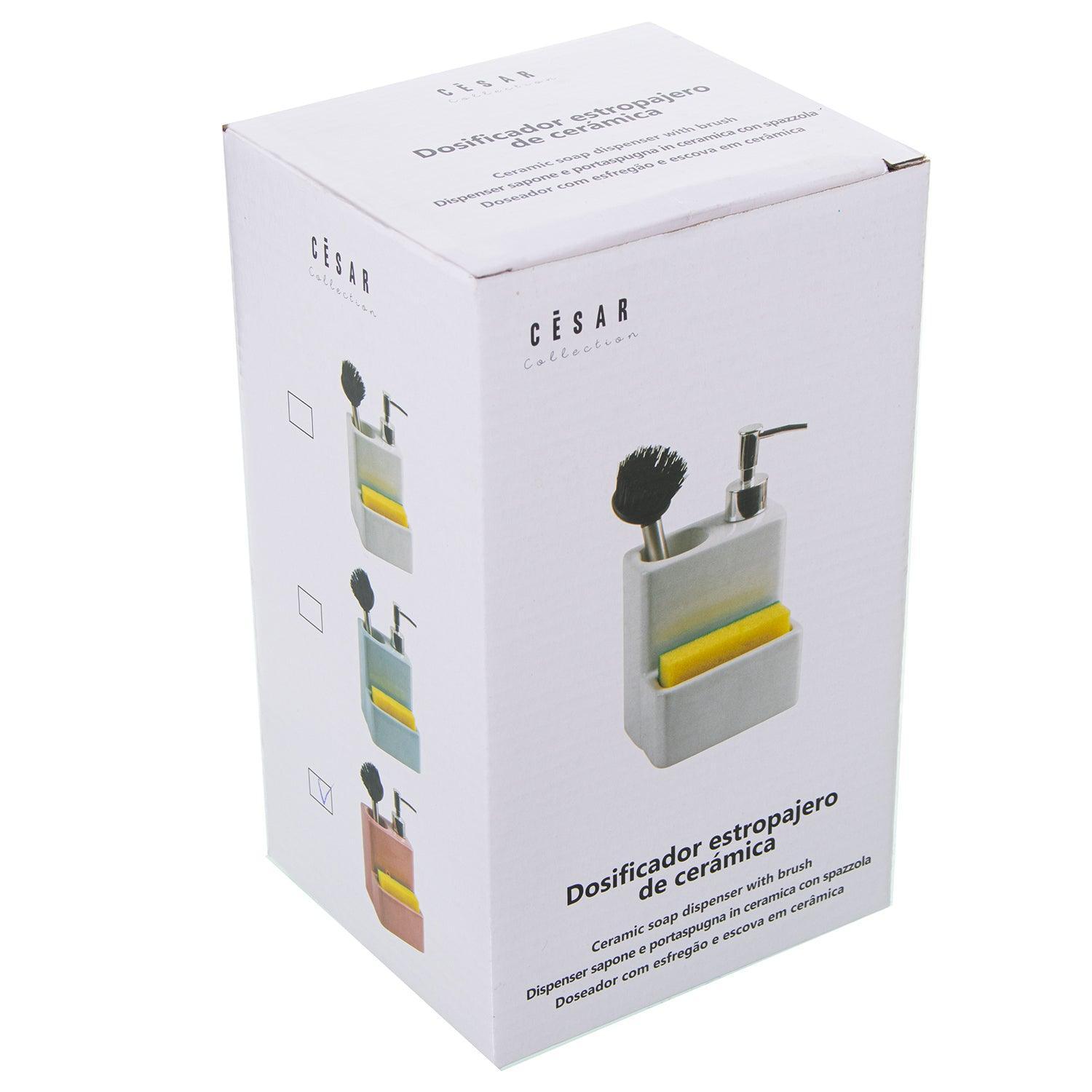 Seifenspender aus Keramik mit Bürste und Schwamm.