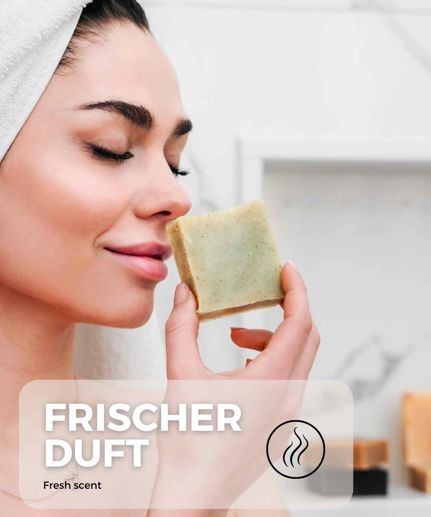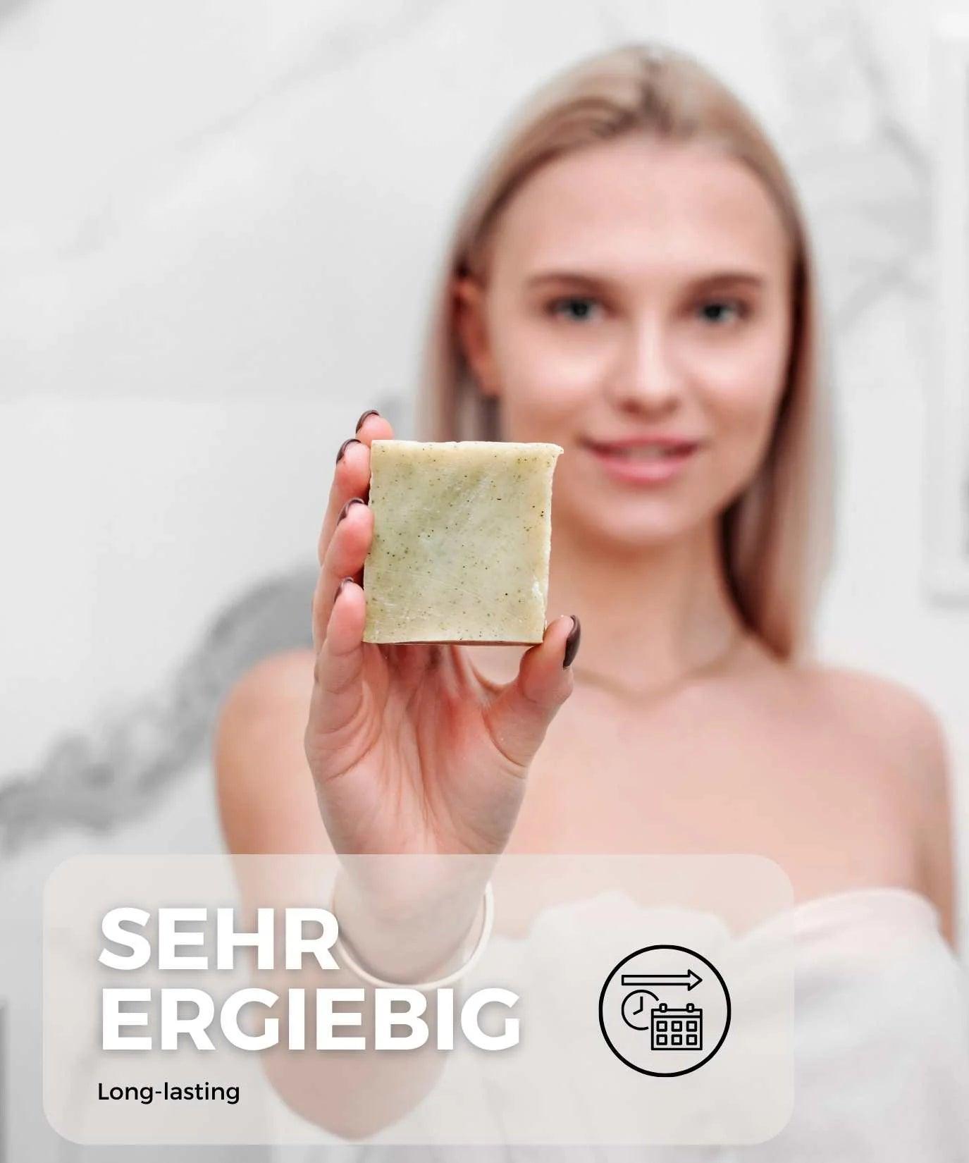 Nach Gebrauch trocken lagern (Seifenschale mit Abtropfrillen). Je trockener die Seife zwischen den Anwendungen, desto ergiebiger – ein Stück hält je nach Nutzung typischerweise mehrere Wochen.