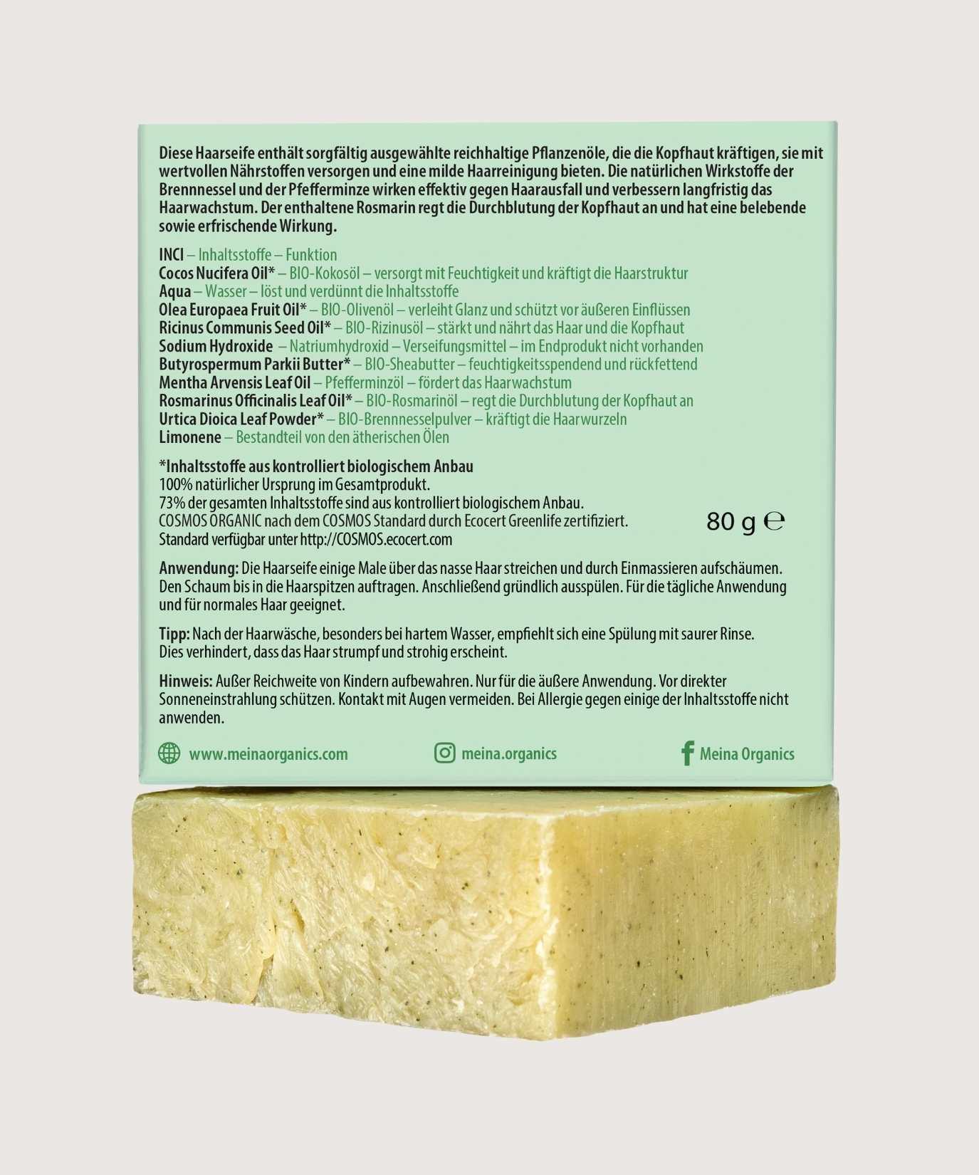 Entdecke die natürliche Kraft unserer Haarseife Meina mit Pfefferminze und Rosmarin – eine innovative Pflege für dein Haar, die nicht nur wirksam ist, sondern auch ein wahres Erlebnis für deine Sinne bietet! Diese sorgfältig formulierte Seife vereint die besten Eigenschaften der Natur und verwandelt deine Haarwäsche in einen Moment purer Entspannung.