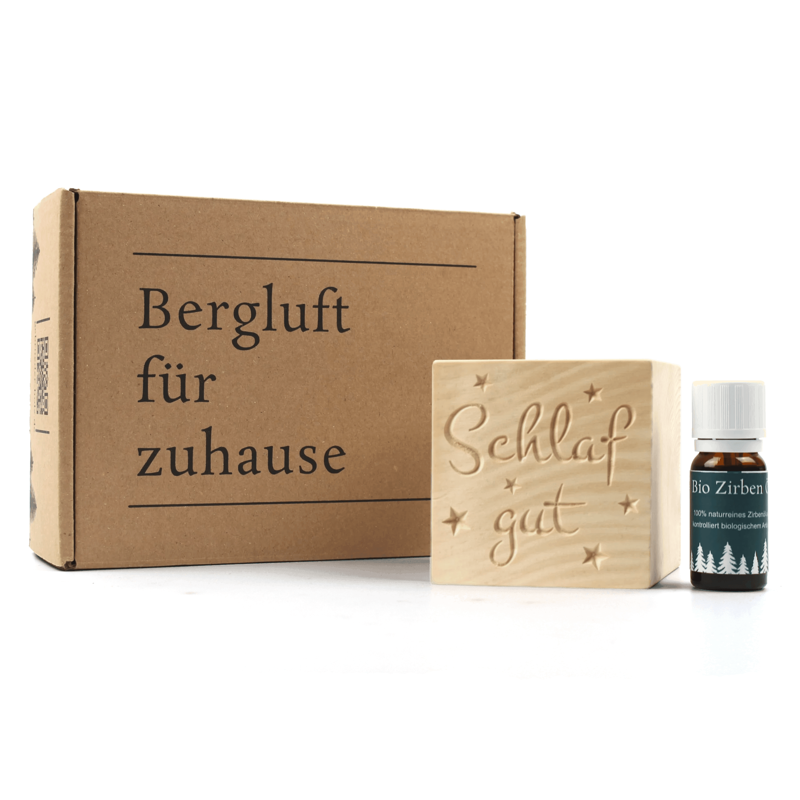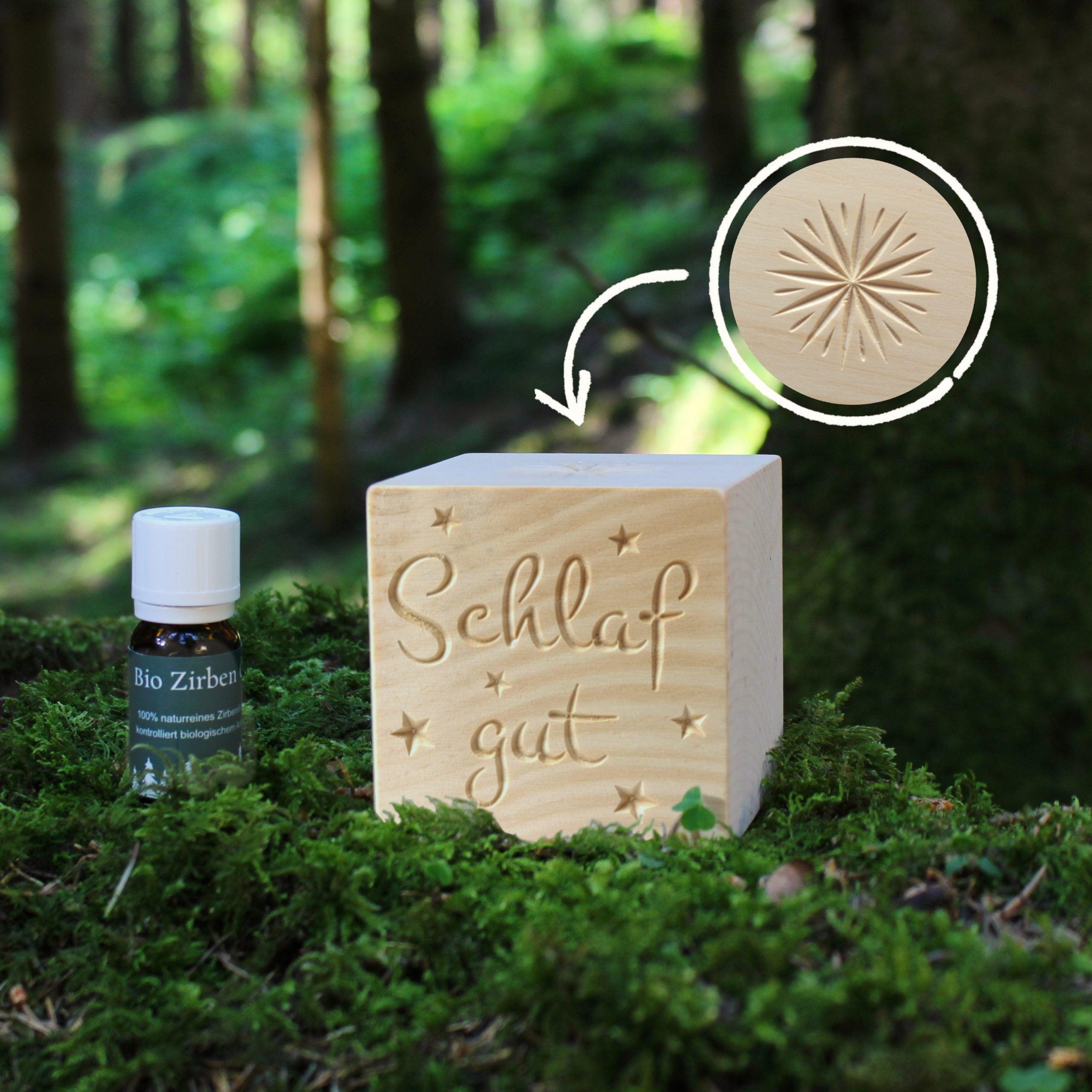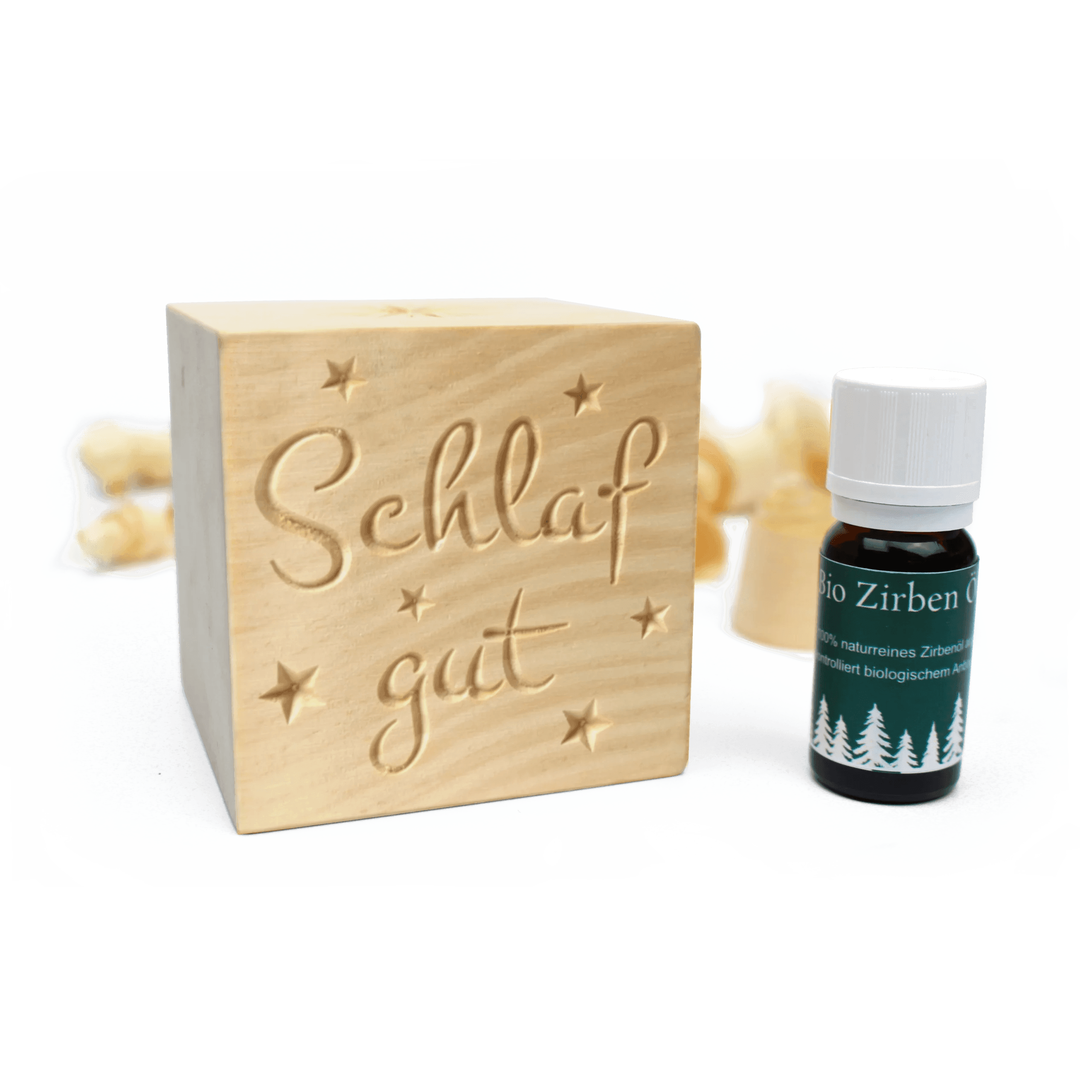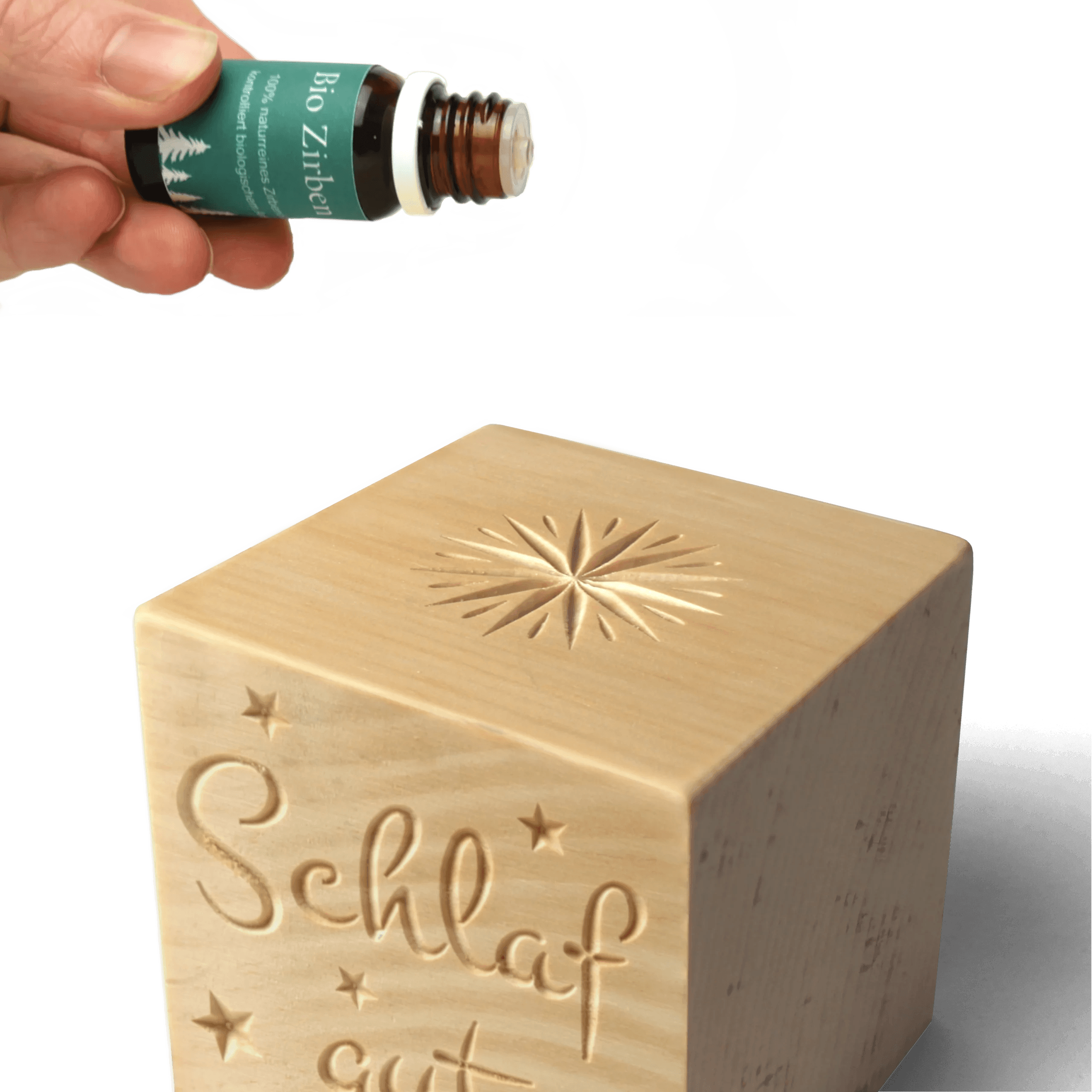 Zirbenwürfel mit Schlafgutmotiv und Tropfstruktur + BIO Zirben-Öl (10 ml)